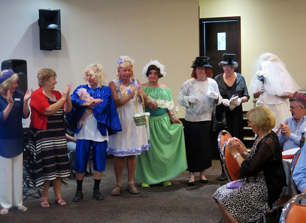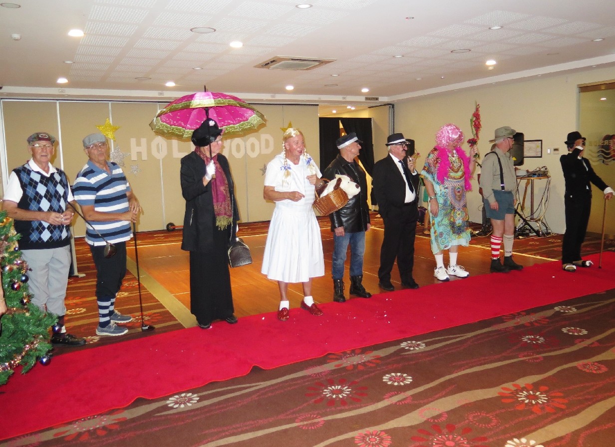 On the 3rd of December, Burleigh Waters Probus had their annual Christmas Dinner at the Currumbin RSL. Members availed themselves to a set menu which consisted of a medley of roasts, followed by dessert- pavlova or plum pudding – – yum. The members were entertained by a band called Sweet Mixjah. This got the more adventurous members up dancing. During the course of the night prizes were given for the lucky door prize and the winner of the trivia. This led to the highlight of the night. Hollywood comes to Burleigh Waters with stars Charlie Chaplin, Benny Hill, Dame Edna, Groucho Marx, Marlon Brando, Judy Garland and Toto, Julie Andrews, Bob Hope and Bing Crosby. Even though a few of the stars might have passed it, they brushed up well on the night. Last event of the night was the raffle of the hampers. A big thank you goes out to the ladies who organised the hampers – Carol, Lynn and Margaret. The end of the night came all too soon. Everyone agreed it was a great night. A Merry Christmas to all
