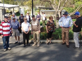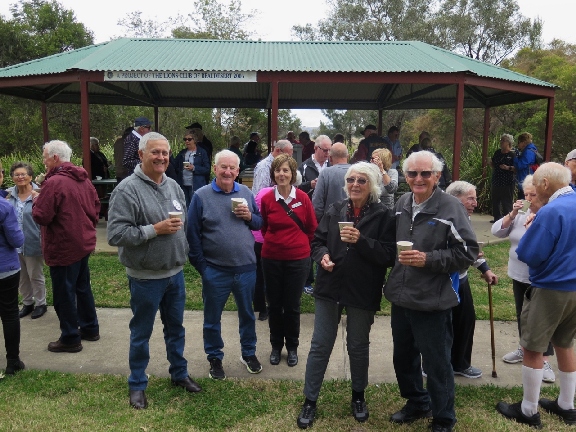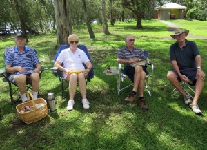 A good contingent of members and wives attended the picnic lunch. It was a beautiful sunny/cool day. We all sat around the tables, full of goodies, while chatting or laughing at various jokes and stories.The Council BBQs were out of action due to the recent floods, so we all brought along sandwiches, cold food and a variety of cakes & cookies. Col C. coordinated the bird watching, while others played petanque.