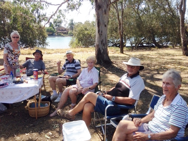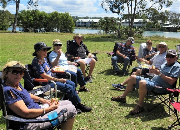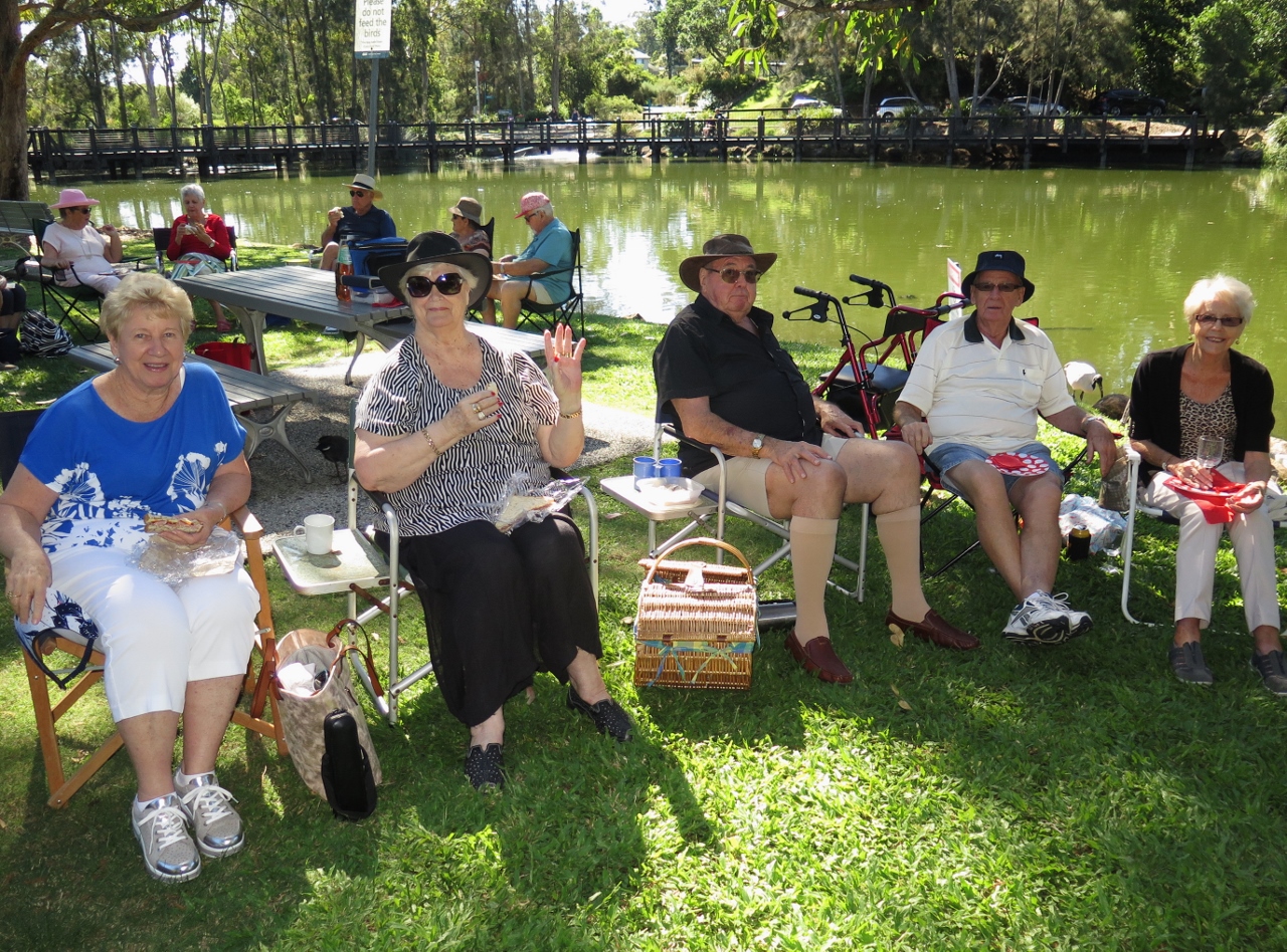 Twenty six of us enjoyed a relaxing BYO Picnic Lunch at Preston Park, Currumbin on 1st October. The circle gradually grew larger as each additional couple arrived on this lovely sunny holiday Monday. The yummy goodies doing the rounds were suitably dealt with during the day. At one stage two dolphins in Currumbin Creek glided past. To top off the day Ngaire also recited two humorous poems which sh had written, The Cake Stall and The Gym.