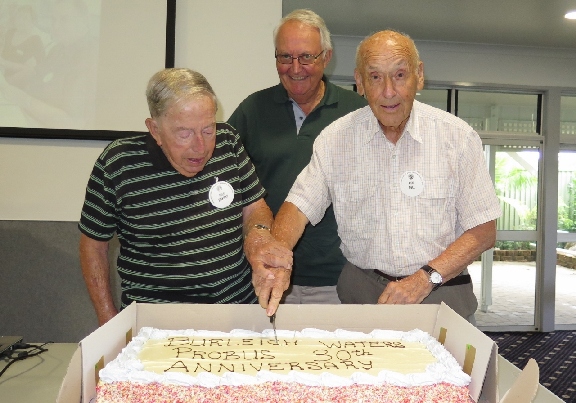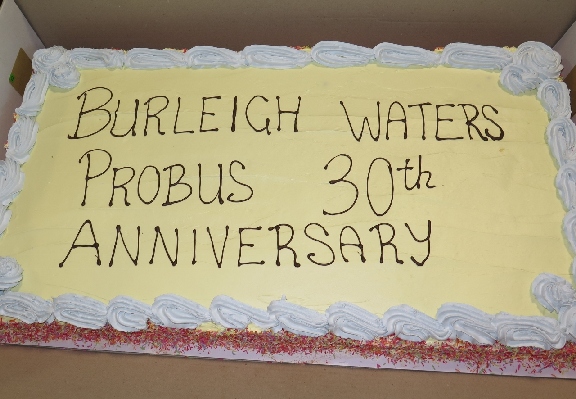 The Probus Club of Burleigh Waters celebrated its 30th Anniversary in February, with Rex and Fred, our two longest serving members cutting the special Anniversary Cake. Previous Presidents Kevin C, Bill C, Brian H, Barry S & Dan N who are still in the Club spoke on their experiences, plus Maureen M spoke on behalf of Terry M, with Keith C also being acknowledged. Displays for members to reminisce were done through photos in albums and on slides shows, publicity information and past history booklets.